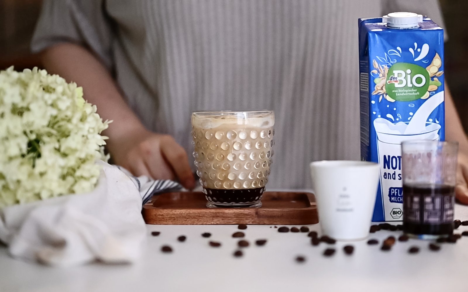 2. Potom si spravte espresso, ktoré prilejete. V malom hrnčeku alebo konvičke si potom pripravte mlieko (môžete použiť klasické, ale aj rôzne rastlinné alternatívy), ktoré pomocou malého mixéra napeňte. Pred konzumáciou premiešajte.