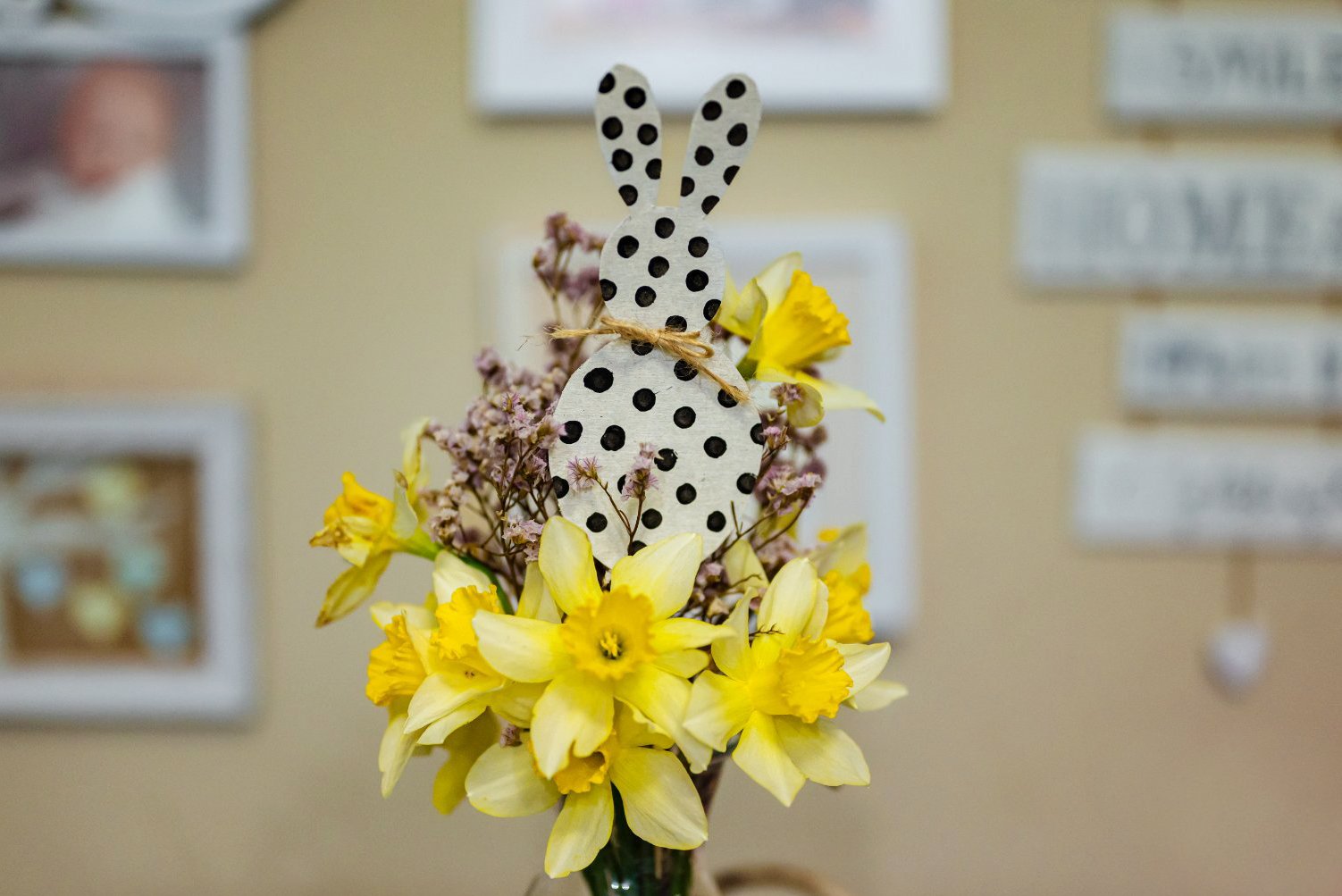 - Priviažte šnúrku či motúz a spravte zajačikovi mašličku okolo krku.