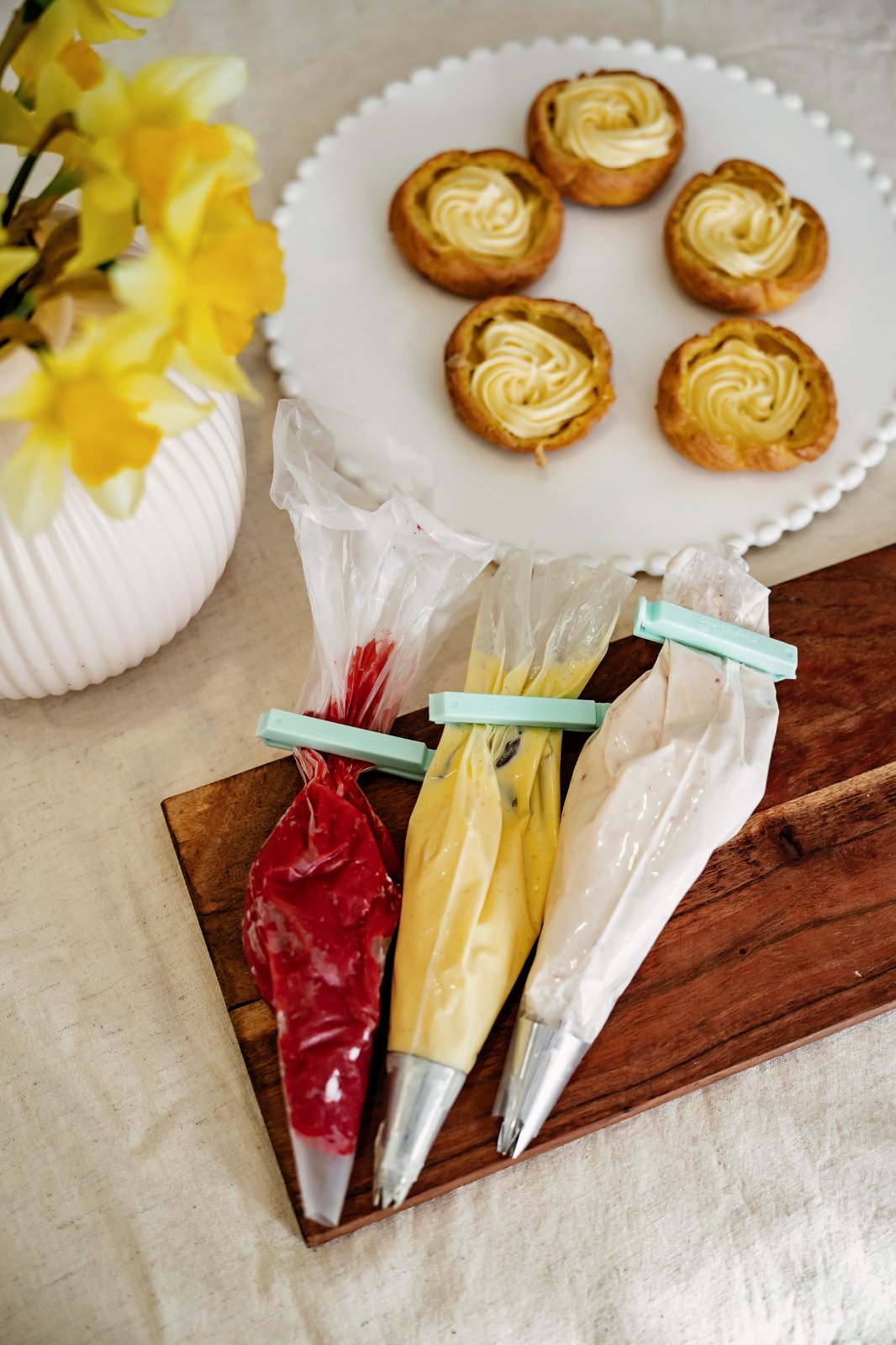 A ide sa skladať a plniť. Najprv si vrchy veterníkov namočíme v čokoláde. Môžete roztopiť čistú čokoládu, ja pridávam aj smotanu na šľahanie a robím ganache. Táto jarná limitka s ovocím je dokonalá a ako stvorená na tieto veterníky. Všetky krémy si dáme do zdobiaceho vrecka. Ja po naplnení vrecká zacvaknem touto svorkou, aby mi krém nevytekal.