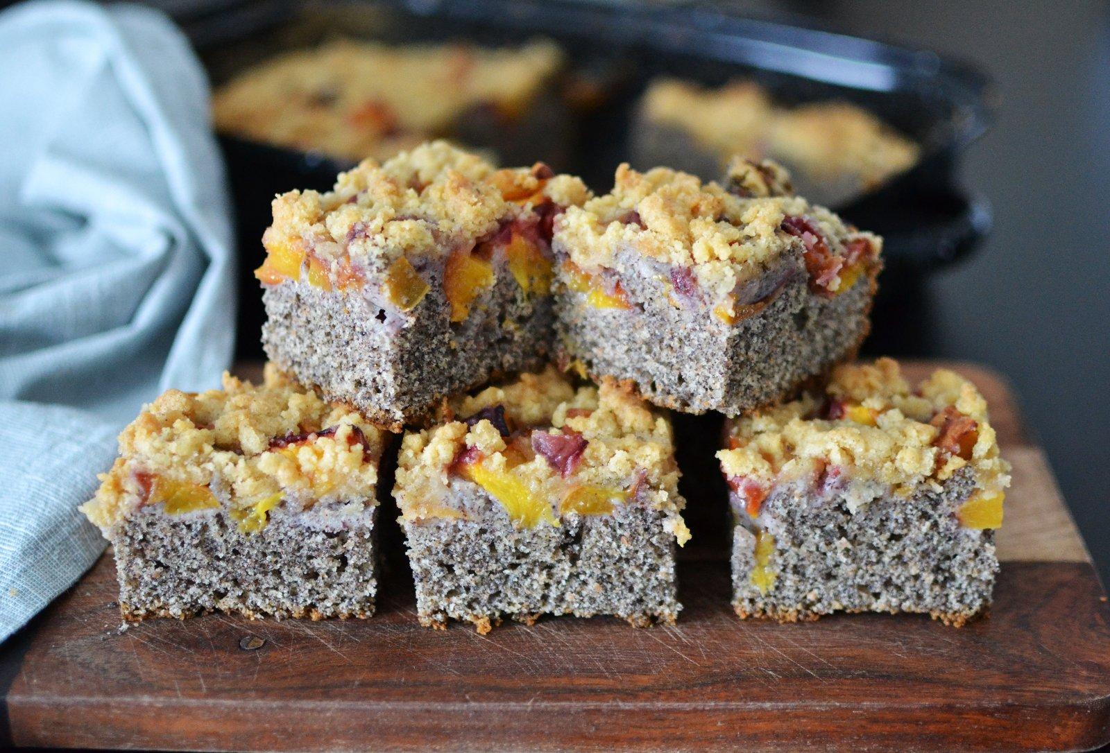 Múku zmiešame s práškom do pečiva, pridáme cukor, štipku soli a premiešame. Olej si rozmiešame s vajíčkami a smotanou a prilejeme k múke. Premiešame, prisypeme aj mak a vymiešame v jednotnú hmotu. Plech vymastíme a vysypeme, prípadne použijeme papier na pečenie. Cesto nalejeme a rovnomerne rozotrieme. Na cesto naukladáme broskyne, alebo iné ovocie. Navrch dáme mrveničku, ktorú si pripravíme z: 100g trstinového cukru, 100g hrubej múky a 75g studeného masla.