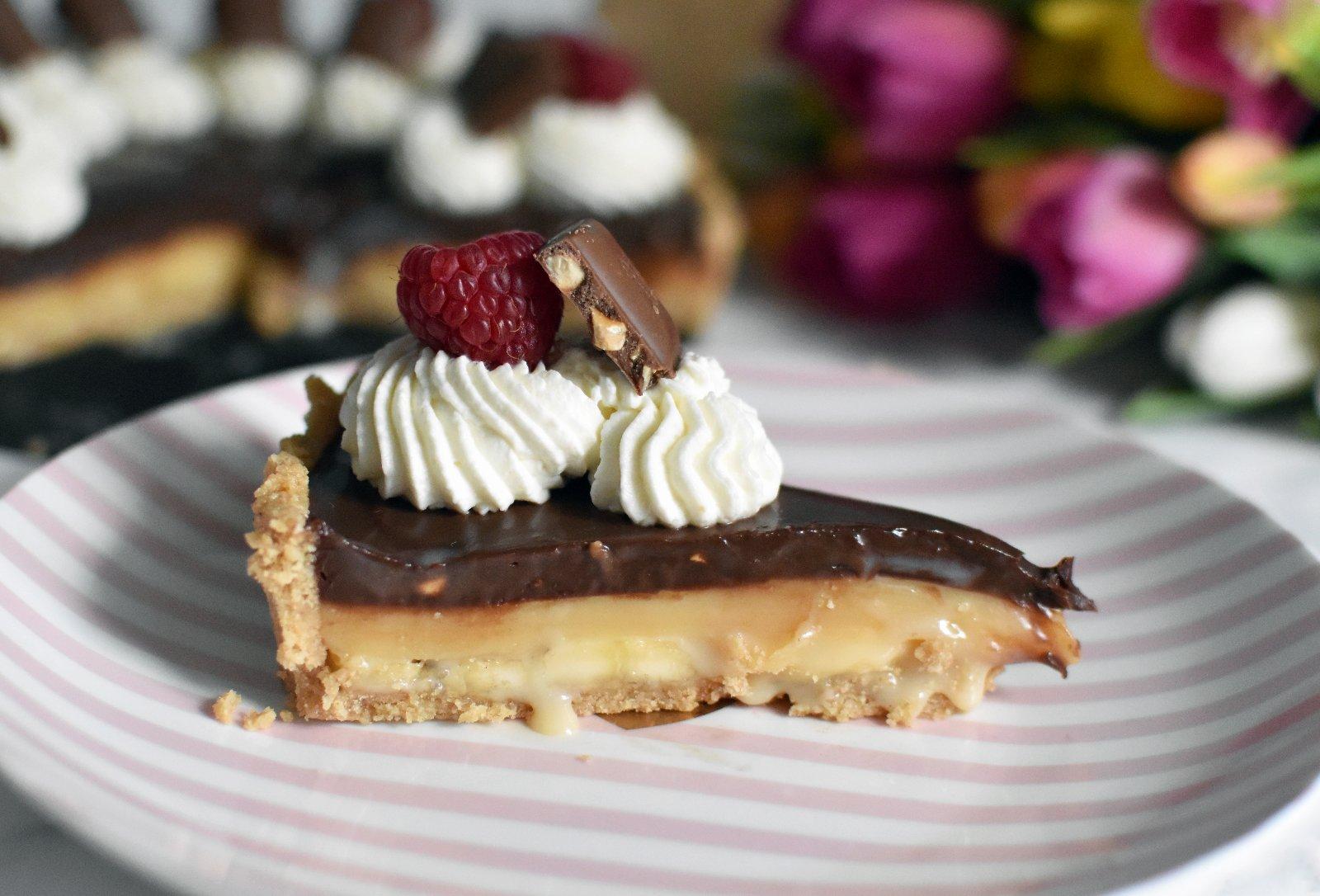 Maslo, Salko, cukor a sirup dáme do hrnca a za občasného varenia varíme, až pokiaľ sa maslo nerozpustí a nevznikne nám jemná masa. Zvýšime plameň a za stáleho miešania privedieme k varu, plameň potom stíšime. Hmota nám začne hustnúť. Pozor, neprežeňte to, aby sa z hmoty nestala žuvačková konzistancia. Necháme bokom trochu vychladnúť a potom nalejeme na sušienkový korpus, na ktorý sme si nakrájali banány. Banány spôsobia to, že sa okolo nich plnka trochu roztečie, aspoň teda mne. Chuti to neuberá, akurát to môže byť trošku neestetické. Môžete banány pre dokonalejší vzhľad vynechať. Ale podľa mňa radšej ubrať na kráse :P
