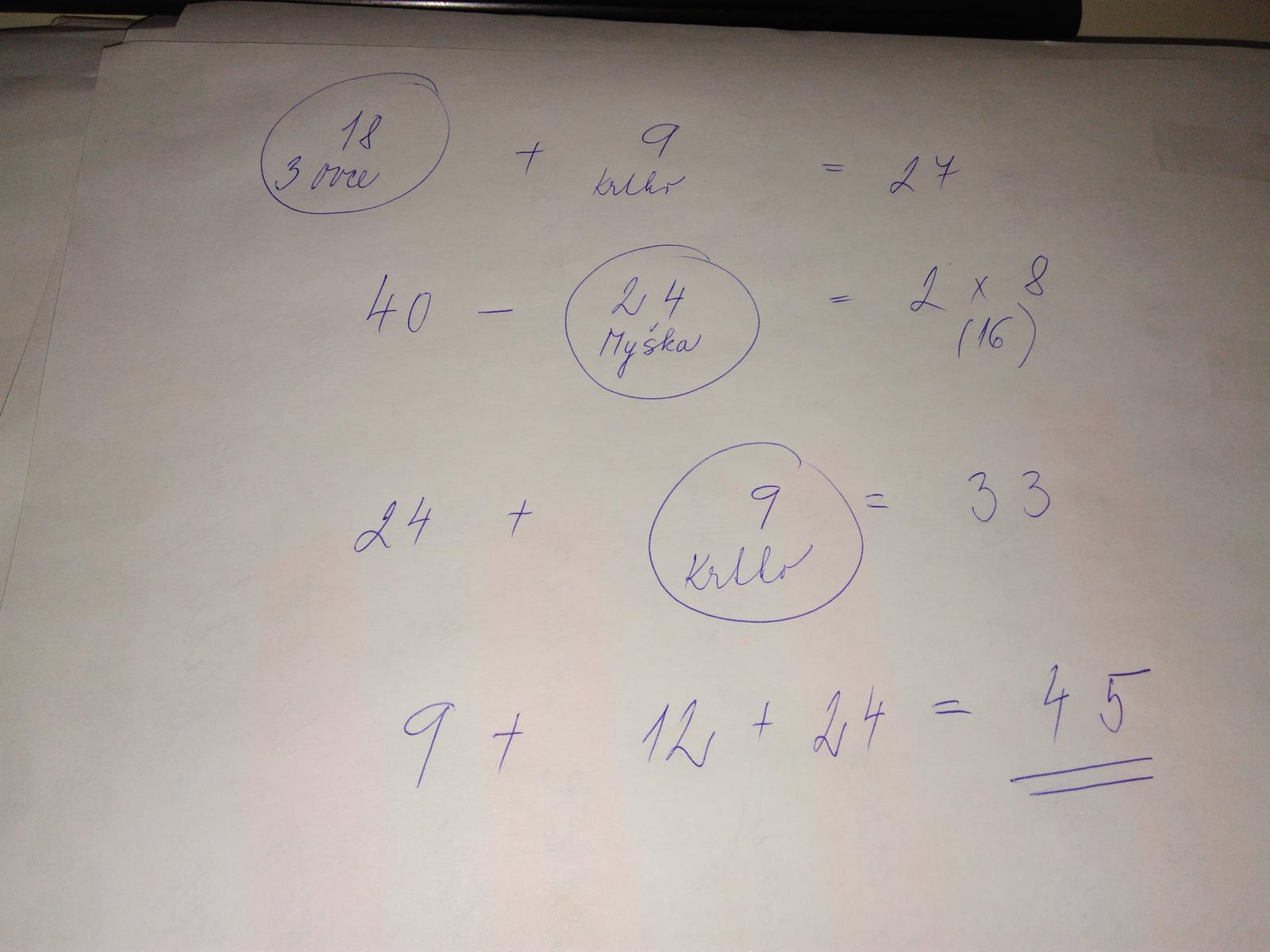 myška ma hodnou 24, krtko 9, JEDNA ovečka 6...Vysledok 45 🙂