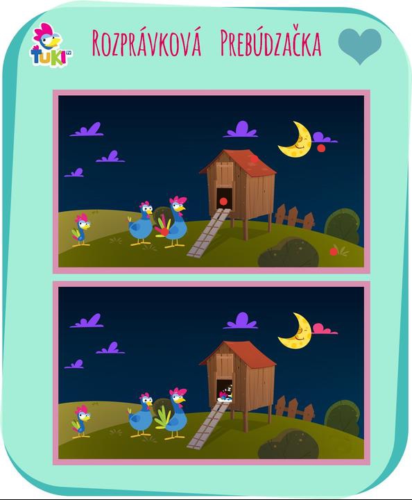 Obláčik pri mesiačiku je inej farby,kohutik ma inak sfarbeny chvost,strecha na kurine je ina,v kurine chybaju sliepočky,chyba trs travy na pravo dole.