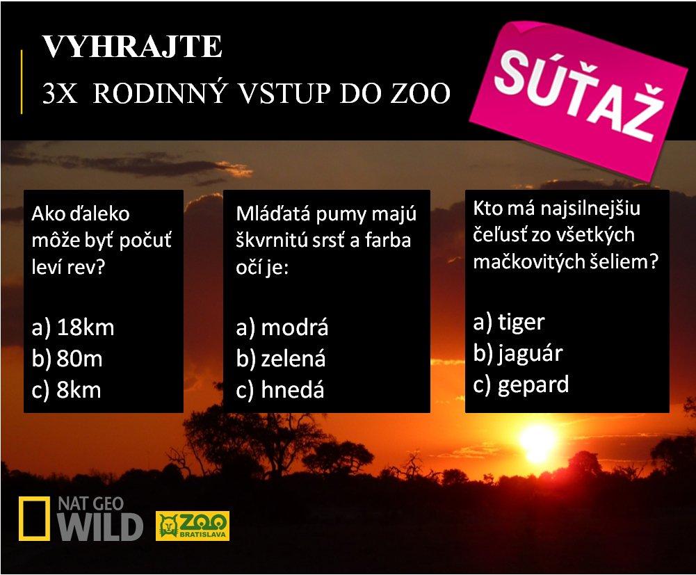 Marec je na Nat Geo Wild venovaný divokým šelmám, o ktorých sa môžete každú nedeľu vďaka tematickým dokumentom dozvedieť veľa zaujímavých faktov 🙂 Je síce super vidieť tieto úžasné tvory na televíznej obrazovke, no nebolo by lepšie vychutnať si ich naživo? 😉 Zapojte sa do súťaže a vyhrajte 3x rodinný vstup do ZOO Bratislava 👏