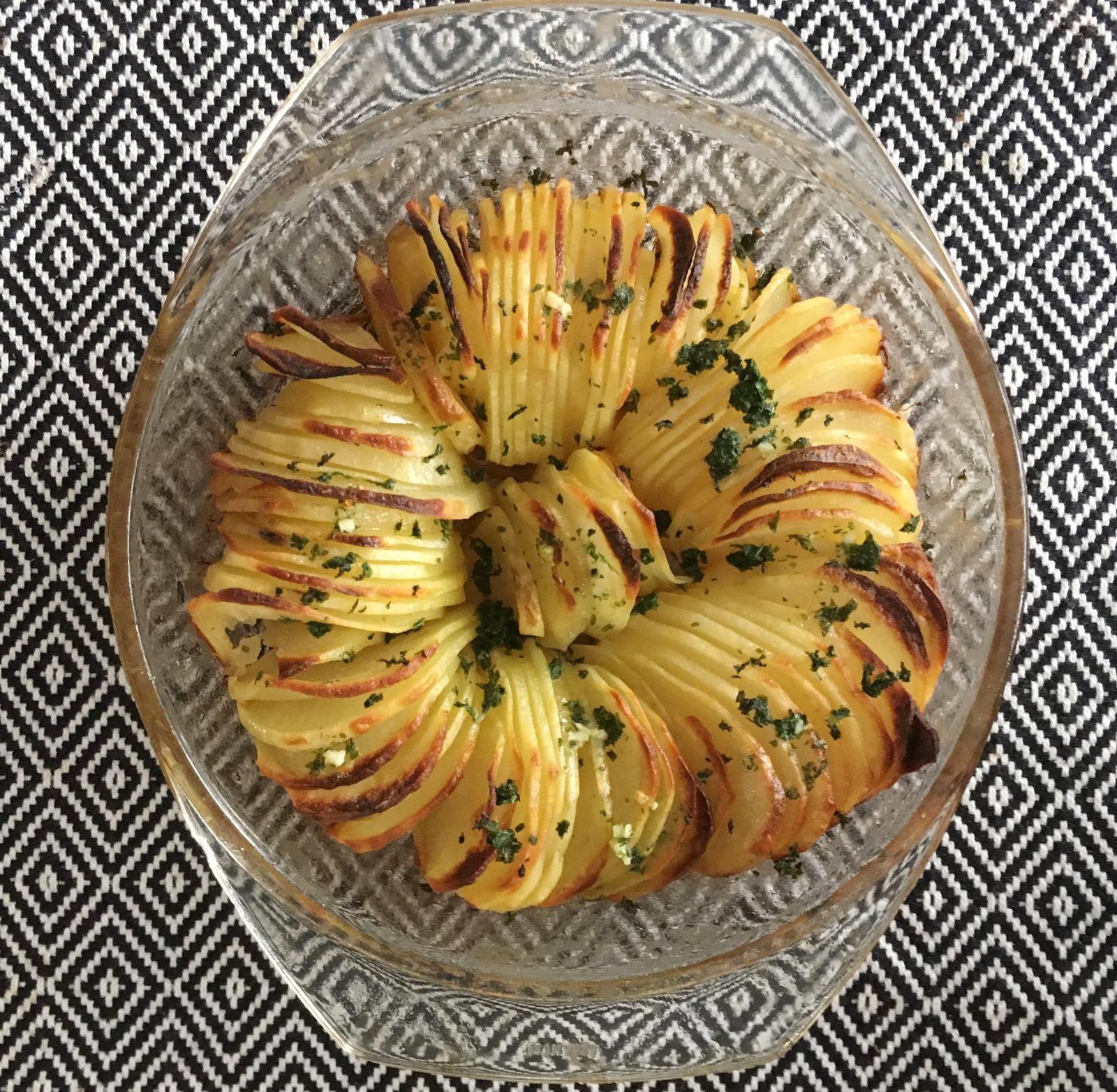 ono su vlastne to iba obycajne zemiaky naukladane do spiraly 🙂 nepredvarene zemiaky som ocistila a narezala na tenke platky, ktoré som rozprestrela na dosku, dala sol+korenie a pokvapkala olivovym olejom. misu som vymazala olivovym olejom, naukladala natesno zemiaky kolom dokola a piekla, tusim cca hodinku, cas som nesledovala. piekla som ich najprv zakryte, potom som ich odokryla, aby schrumkaveli. pripravila som si este bylinkovo-cesnakove maslo - trochu zmaknute maslo som zmiesala s roztlacenym cesnakom, petrzlenovou vnatkou a solou. poriadne som to premiesala, sformovala do valceka, zabalila do alobalu a dala stuhnut. na upecene zemiaky, horuce, prave vytiahnute z rury, som potom nakrajala platky toho masla, ktore sa roztopili.