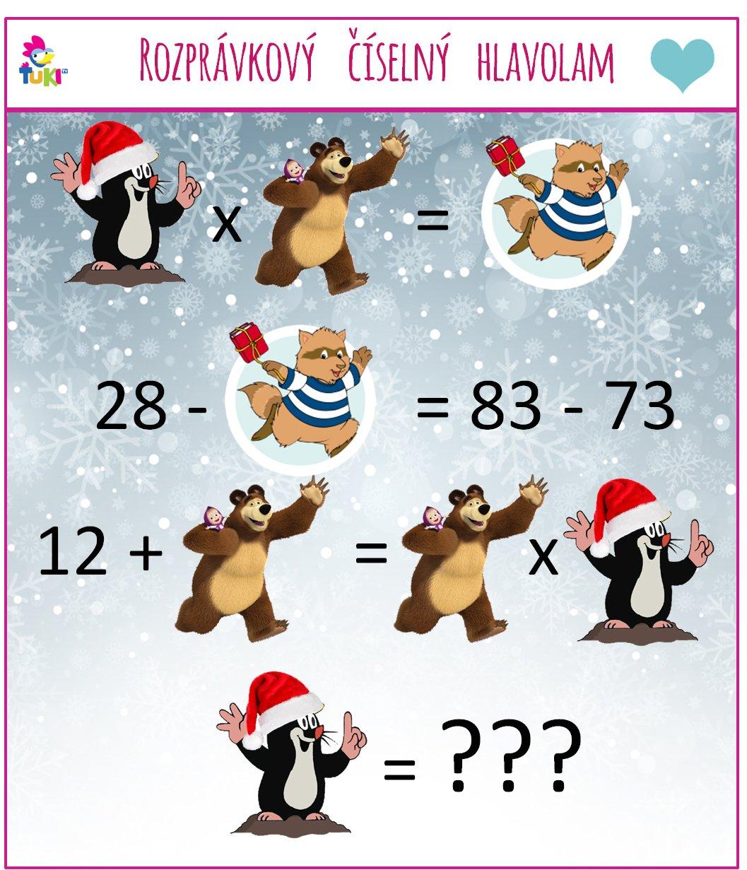 Prajem pekné ráno 🙂 Ešte sme tento týždeň nemali matematickú prebúdzačku za 2 #srdiecka ❤, ideme na to? ;) Počítať budeme s postavičkami z Ťuki TV - Krtkom, Mášou a medveďom a Timothym. Vypočítate, akú hodnotu má Krtko? 🙂#magio_tv, #tuki_tv