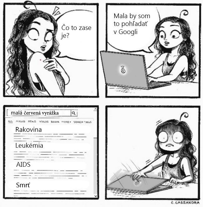 K tomuto mam taku usmevnu prihodu 😀 😀 😀Maly je nas prvorodeny,takze sa ucime na nom a ked mal par mesiacov sa mu na hlavicke zozadu urobilo take hole miesto,vlasky vypadane..No nic sme o tom nevedeli,tak som supla do googlu,ze "hole miesto na hlavicke babatka" a tam mi hnrd vyskocil nejaky latinsky nazov diagnozy,ktoru ked ludia maju,tak to znamena,ze nebudu mat nikdy v zivote na tele chlpy,ani vlasy nebudu mat 😀 No my s muzom totalna panika,uz sme chceli k doktorke bezat 😀 Potom reku,ze skusim supnut do googlu,ze "vypadavanie vlasov u babatka" a bum razom mi to naslo kopu odkazov,ako je to uuuplne v poriadku,tazka pohodka a taaaak 😀 😀 😀No skoro sme odpadli 😀 A inak ja som si minuly tyzden diagnostiovala s googlom infarkt myokardu a cuduj sa svete,som stale tu 😀 😀 😀