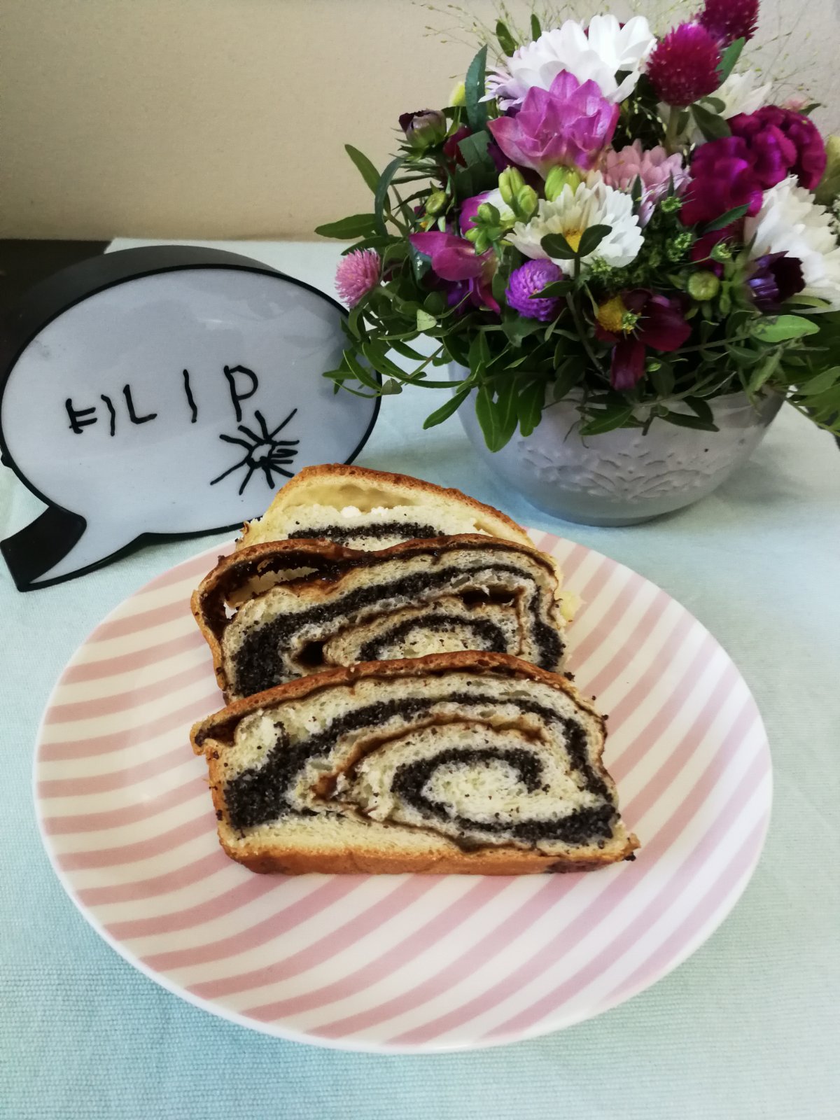 Môj malý muž zorganizoval celú rodinu, aby mi prichystal odmenu. S tatom bol kúpiť kvetinku. S babinou mi upiekol koláč. A samozrejme sa nezabudol popísať, aby bolo jasné, kto to všetko spískal 💞