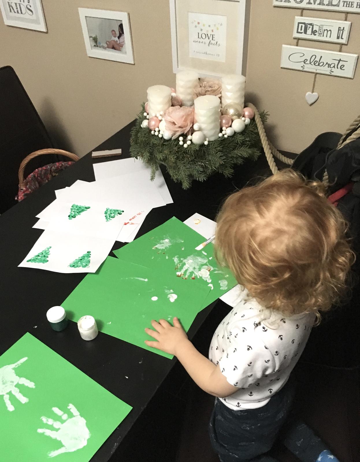 Veľkovýrobňa vianočných pozdravov u Fifiho a Dominiky ✌️️💌 Farby máme až za ušami, ale snáď potešíme zopár známych ☺️ A mama si spravila ďalšiu zábavku na večer, bude sa dokreslovať. Zo zelených odtlačkov prstov budú stromčeky 🎄 a z bielych odtlačkov ruky snehuliaci ⛄️