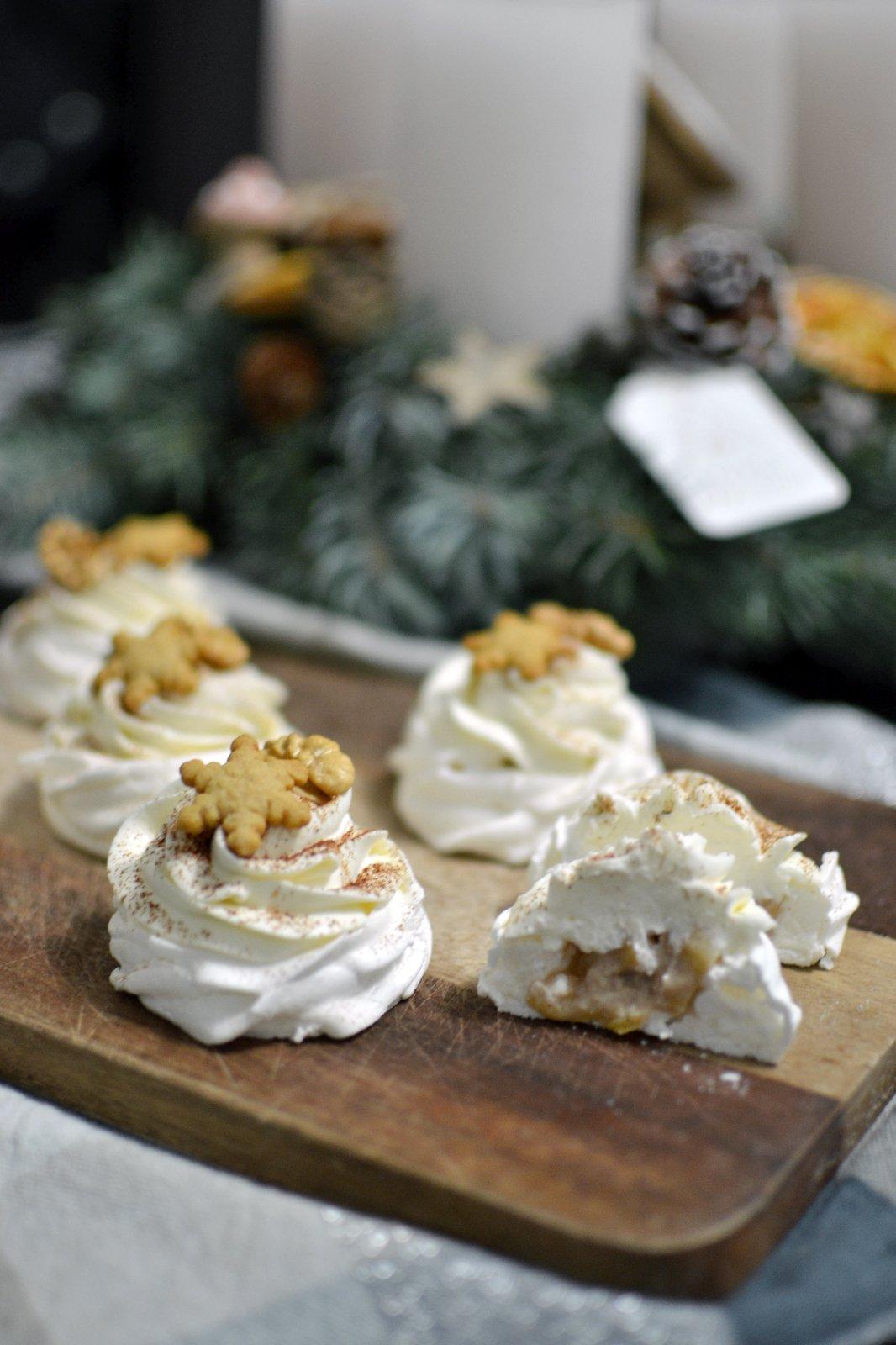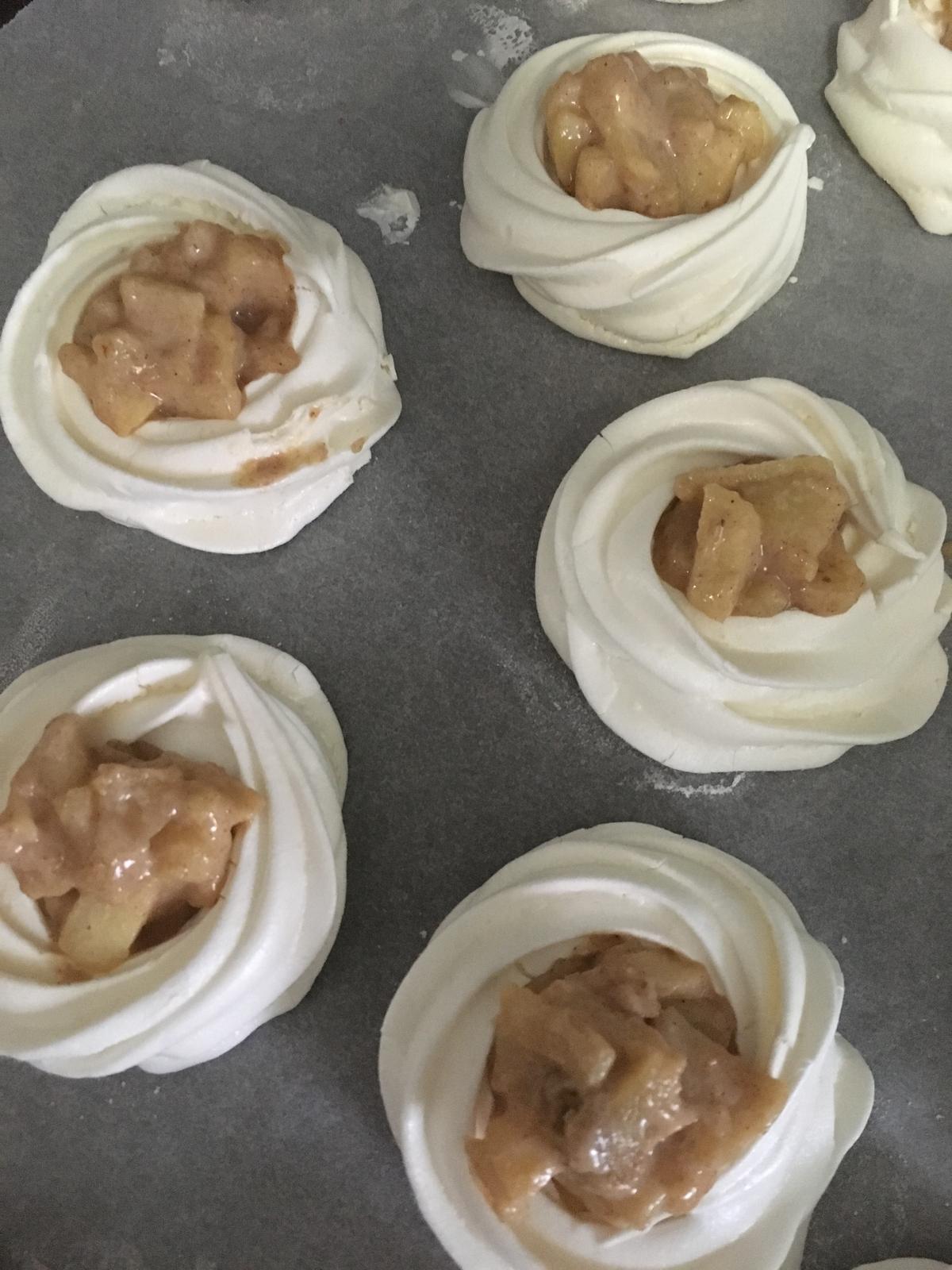 Vyšľahaný sneh si dáme do zdobiaceho vrecúška. Na papier na pečenie si spravíme kruh (buď lyžicou, alebo ja som to robila priamo so zdobiacim vrecúškom) a vytiahneme „múry“ dohora. Aby nám vzniklo také hniezdo.