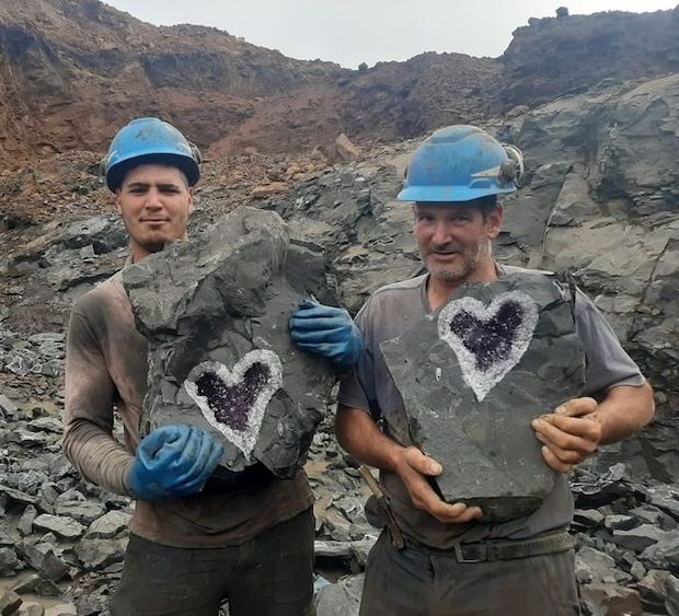 Úžasná ametystová geóda v tvare srdca objavená baníkmi v Uruguaji.
