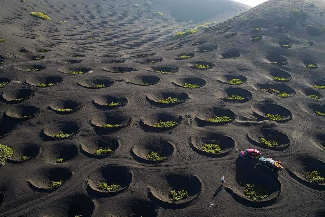 V letech 1730 až 1736 probíhaly na Lanzarote, součásti Kanárských ostrovů, mohutné sopečné erupce, které předurčily další život místních obyvatel. Základem pro pěstování révy je tady lávová hmota, která v noci váže vlhkost z ovzduší. Systém pěstování révy je tu zcela odlišný od toho našeho. Neexistují tu podpěry a vedení rostlin, vinná réva se tak doslova plazí po zemi a hrozny vína jsou v přímém kontaktu se sopečnou půdou. Dalším typickým jevem tu je neustálý vítr, který přináší vláhu od Atlantiku. Aby byla vinná réva proti silnému větru chráněna, sází se často do prohlubní širokých až několik metrů a dalším ochranným prvkem jsou kamenné zídky různých tvarů. To vše vytváří charakteristický vzhled zdejší vinařské krajiny. Můžeme zde najít zhruba 2000 ha vinic a místní vinaři produkují vína, která vyhrávají na mezinárodních soutěžích.