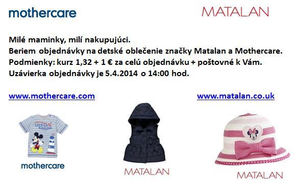 Milé maminky, milí nakupujúci. Beriem objednávky na detské vecičky Matalan www.matalan.co.uk a Mothercare www.mothercare.com. Podmienky: kurz 1,32 + 1 € na celú objednávku + pošta k Vám. Ak máte o niečo záujem, rada Vám objednám. Uzávierka objednávky je 5.4.2014 o 14:00 hod. Pekný deň. Katka