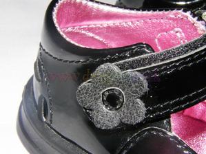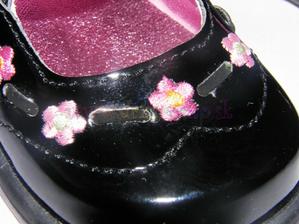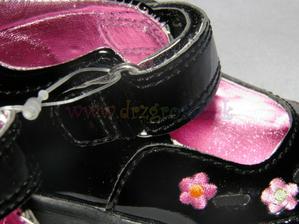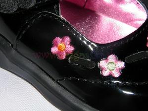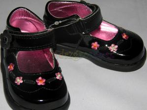 Lakované topánočky, pracka na suchý zips, na konci kvietok, vyšívané kvietkami, pevná podrážka, ružové lesklé vnútro. Veľkosť č.18, vonkajšia dĺžka 12,5cm.
