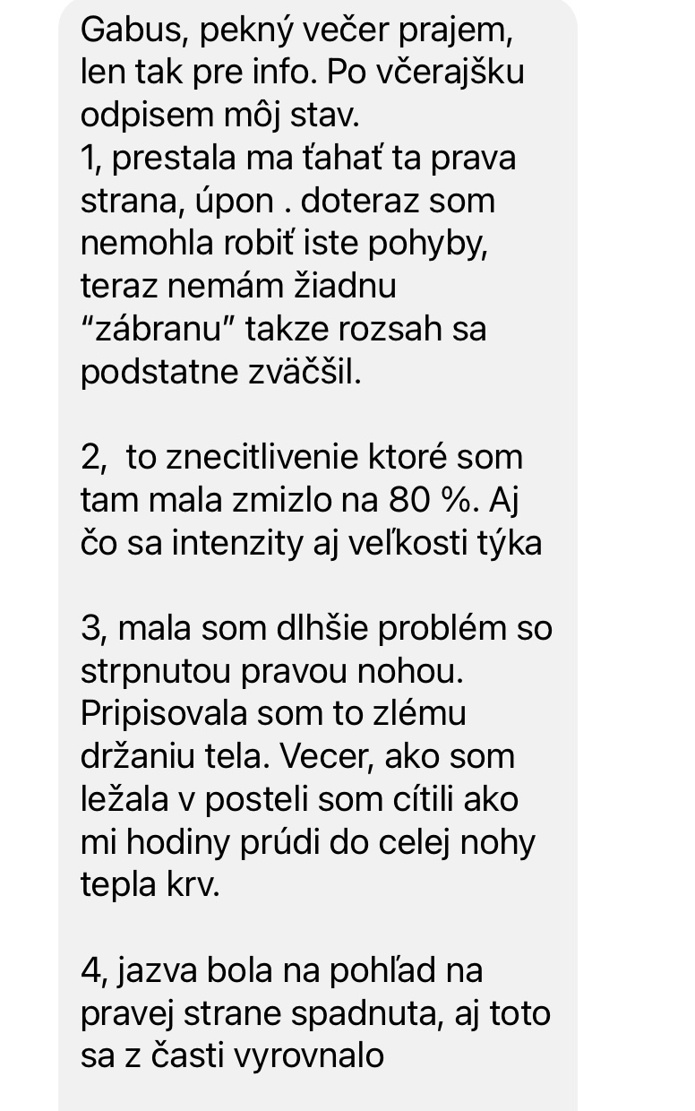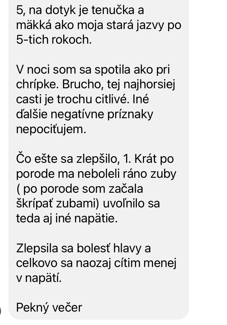 Jednej z účastníčok som ošetrovala jazvu po cisarskom reze. Mala 3 mesiace po cisárskom reze vyrazné problémy s bolestivostou, ťahaním a vystreľovaním bolesti, tŕpnutím nohy , a čo nám nepovedala tak aj bolesťou zubov (ano zda sa to ze to nesúvisí, ale môže a v tomto prípade súviselo).