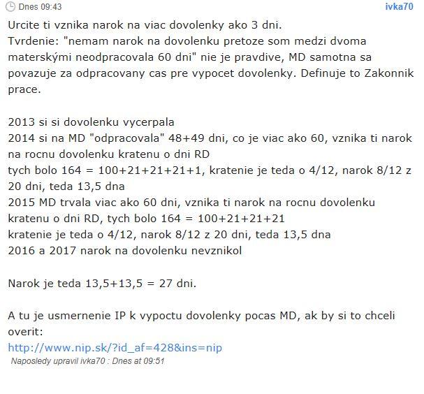 @dzina007 Ja som dovolenku riešila nedávno kvôli dcére, a v článkoch čo som preštudovala, všade bolo uvedené, že materská sa ráta do odpracovaných dní, rodičovská nie. Ale aj napriek tomu že som to mala overené od vedúcich 2 učtárni - dcére neuznala majiteľka celú dovolenku. Volala som na inšpektorát práce, a tam mi bolo povedané, že oni sa zaoberajú iba písomným žiadosťami, vtedy si preverujú konkrétne nároky, inak po telefone, že neručia za svoju odpoveď.