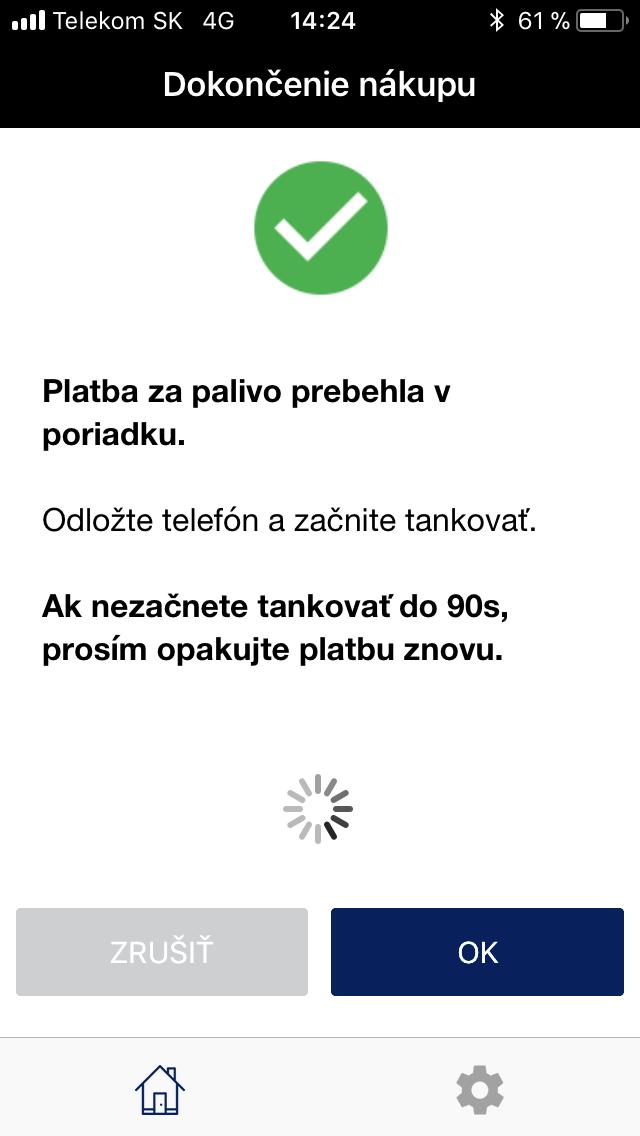 Ak ste všetko správne zadali a potvrdili, dostanete sa na obrazovku s hláškou o prebehnutí platby (medzitým mi cinkla aj SMS z banky), a máte 90 sekúnd na začatie tankovania.
