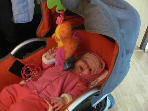 Hrám sa už nielen na dečke a pod hrazdičkou, ale aj počas prebaľovania. Šetrí to čas, zabijem tak dve muchy jednou ranou: aj mam riťku v suchu aj sa zahrám, alebo niečo poskúmam. To isté pri kočíkovaní. Mama vytuningovala kočík a mám z neho teraz pojazdnú hračkáreň. Takže sa vetrám a hrám zároveň. Nechápem, ako som v ňom mohla kedysi len spať.