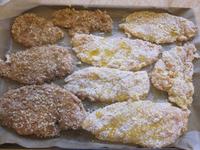 kuracie prsia pozdĺžne nakrájať na 3 časti, naklepať, posoliť, okoreniť, obaliť v múke, vajíčko, strúhanka so sezamovými semienkami, poukladať na plech s papierom na pečenie, preliať olivovým olejom, piecť na 180 st. 20 minút, potom rezne obrátiť a ešte piecť do požadovaného sfarbenia pred vložením do rúry: