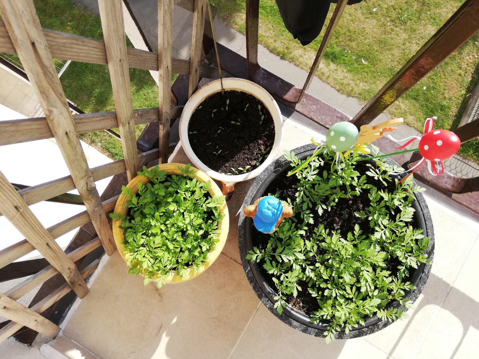 Mám balkón 2x1 m 😂. Rastú mi tu aksamietnice, ktoré som zasadila zo semien. Začína vykúkať vňaťový petržlen. A plánujem ešte do väčších nádob kôpor - ten veľa používam do jedál pre krpca. Mám tu aj šalviu, nejako mi však tento rok neožíva 😐.
