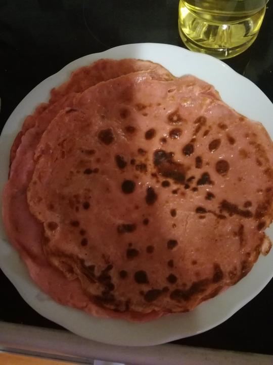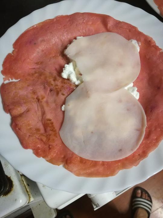 Ahojte,Dnešný obed ale i večera.Palacinky cviklové na slano😊Plnené cottage cheese+šunka;tatarska omáčka,šunka,nastruhaný syr.Dobrú chuť!!😉