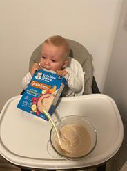 Keďže mu do kaší pridávame vymixované ovocie, tentokrát sme ho nepridali a kaša sa stretla s obrovským úspechom.