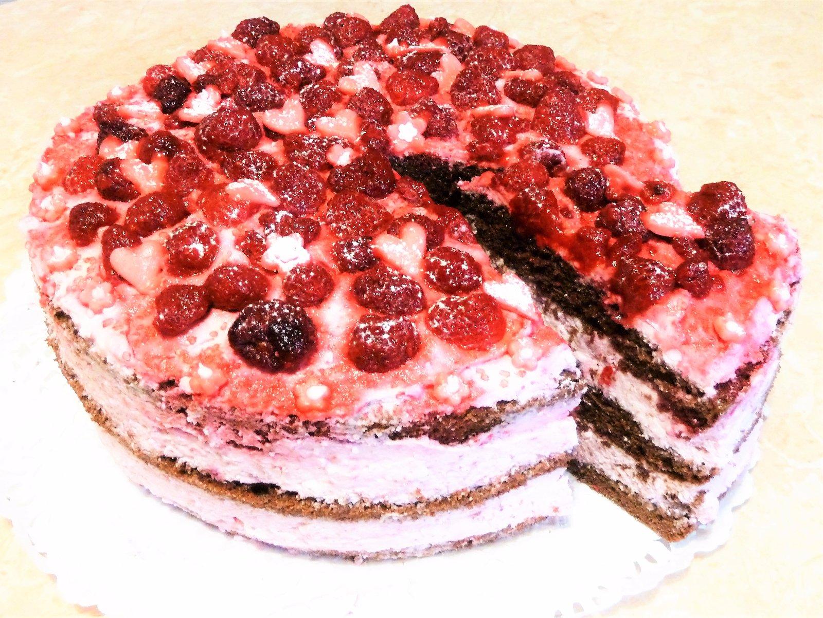kakaový korpus, malinový krém s mascarpone a tvarohom