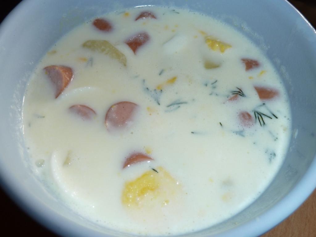 autorvdaka, je to jednoduche, ocistene zemiaky uvaris vo vode do makka, pridas mlieko - cca 1 liter, povaris chvilku, zahustis, ochutis solou, natvrdo uvarene vajicka nakrajas na kolieska, vlozis do polievky s trosku kopru, napokon na kolieska nakrajany parok a hotovo, kto ma rad, moze dochutit octom, aby bola sladkokysela 🙂