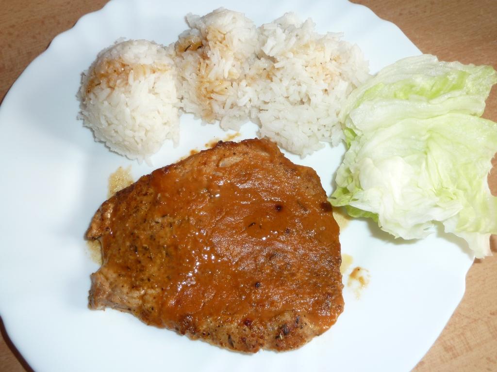 kare naklepeme, posolime, posypeme korenim, ja som dala korenie na bravcove pecene a prudko osmahneme na oleji z oboch stran, dame do zapekacej misy, do vypeku dame 3PL horcice a 3PL kecupu, zamiesame a vyleleme na masko, pecieme v rure cca 1/2 az 1hod podla hrubky reznov do makka