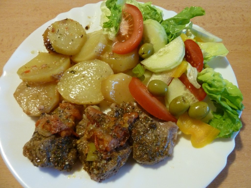 bravcove s bylinkami, opekane zemiaky a zelenina