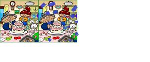 1. ručičky na hodinkách 2.starkej drdol(ihlica) 3. ručky na skrinke vpravo hore 4.v skrinke v polici (v ľavo miska, v pravo panáci) 5.na plechu rozdielne koláče 6. banány 7.v pravo dole kvet 8.dievčatku chýba ponožka 9. dva biele zavesené taniere, na jednom je smajlík 10.mačka má lízatko 11.obraz na stene (kopec) 12.starká golier na košeli 13.dievča vyplazený jazyk 14.poleva na spodnej časti torty 15. vrch záclonky