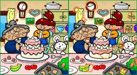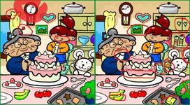 1. ručičky na hodinkách 2.starkej drdol(ihlica) 3. ručky na skrinke vpravo hore 4.v skrinke v polici (v ľavo miska, v pravo panáci) 5.na plechu rozdielne koláče 6. banány 7.v pravo dole kvet 8.dievčatku chýba ponožka 9. dva biele zavesené taniere, na jednom je smajlík 10.mačka má lízatko 11.obraz na stene (kopec) 12.starká golier na košeli 13.dievča vyplazený jazyk 14.poleva na spodnej časti torty 15. vrch záclony
