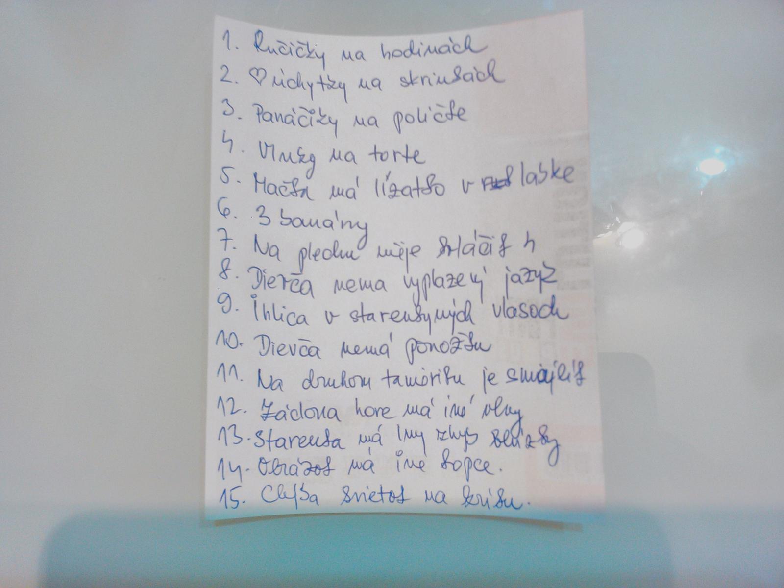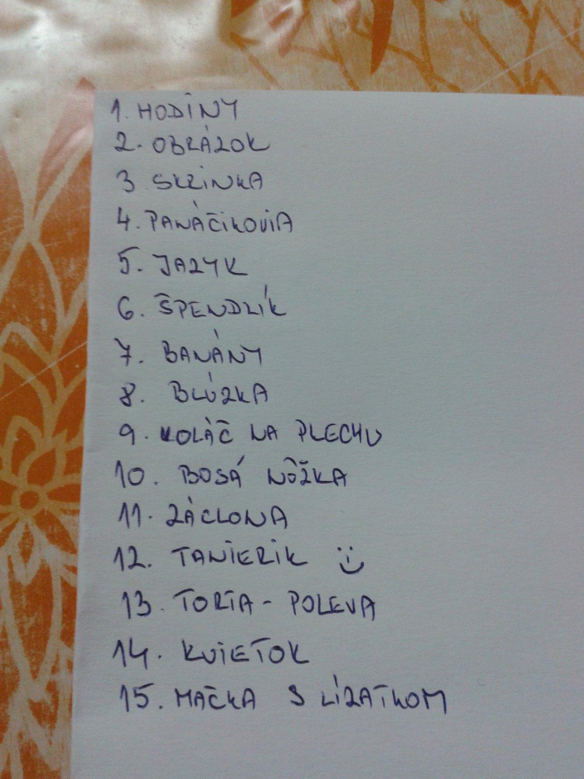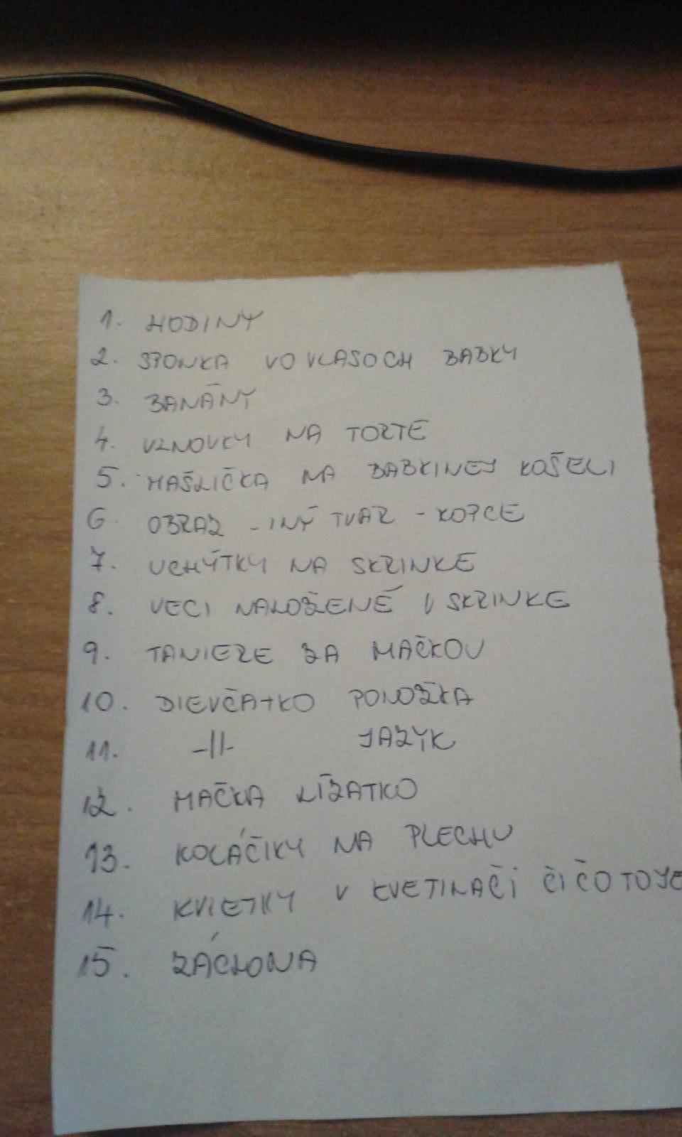 Hodiny, 2.spendlik vo vlasoch, 3.uchytky na skrinkeuchytky, 4.poleva na tortepoleva, 5.bluzka pri krku, 6.kolacik na tacke, 7.kvetinka v kvetinaci, 8.vaza na policke, 9.tanier na policke, 10.nieco v labke macicky, 11.kopec na obrazku, 12.bosa nozka u dievcatla, 13.jazyk u dievcatka, 14.banany, 15.zaclona