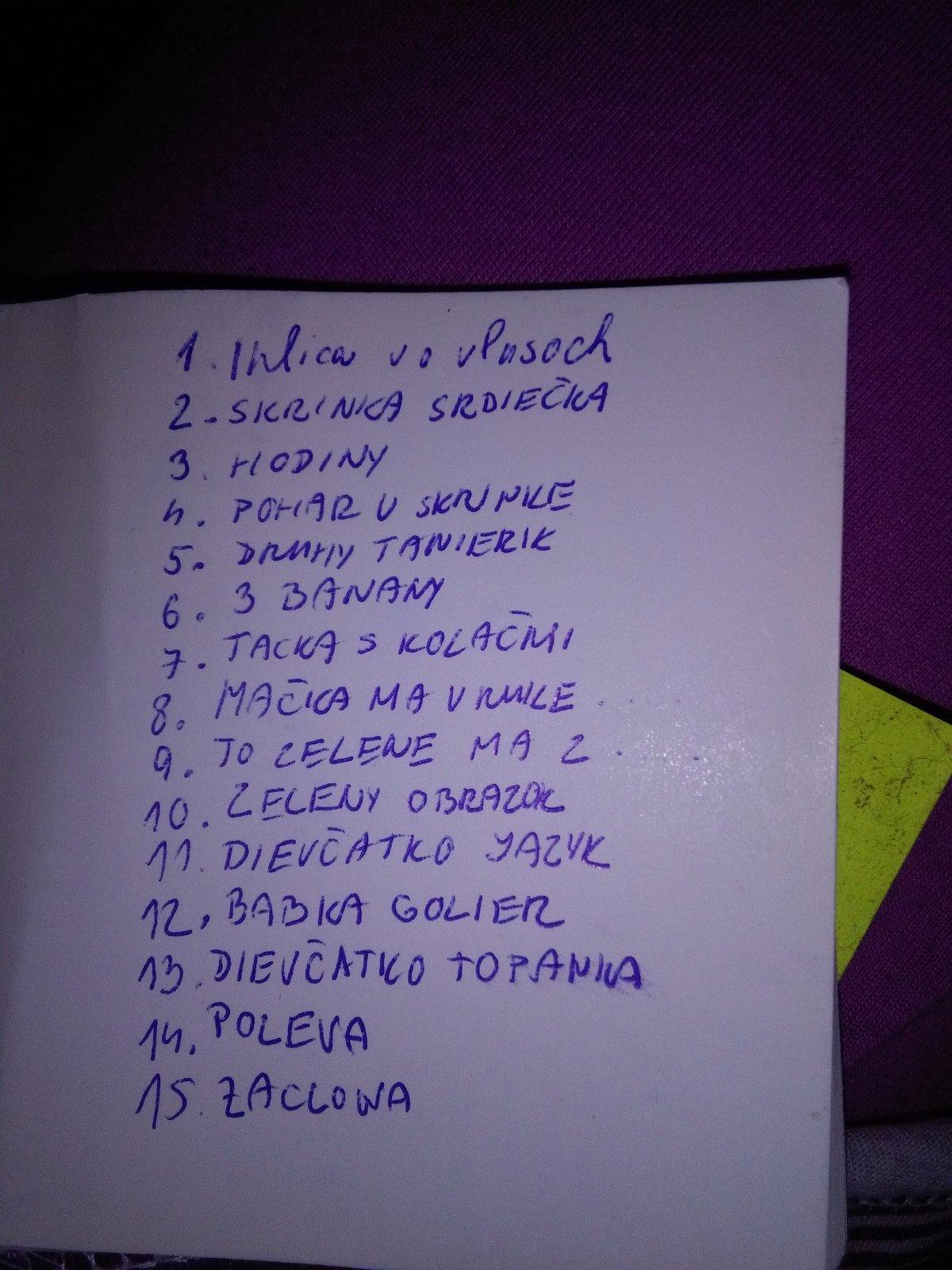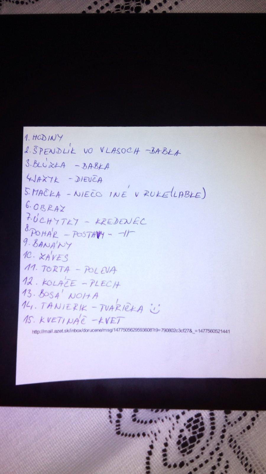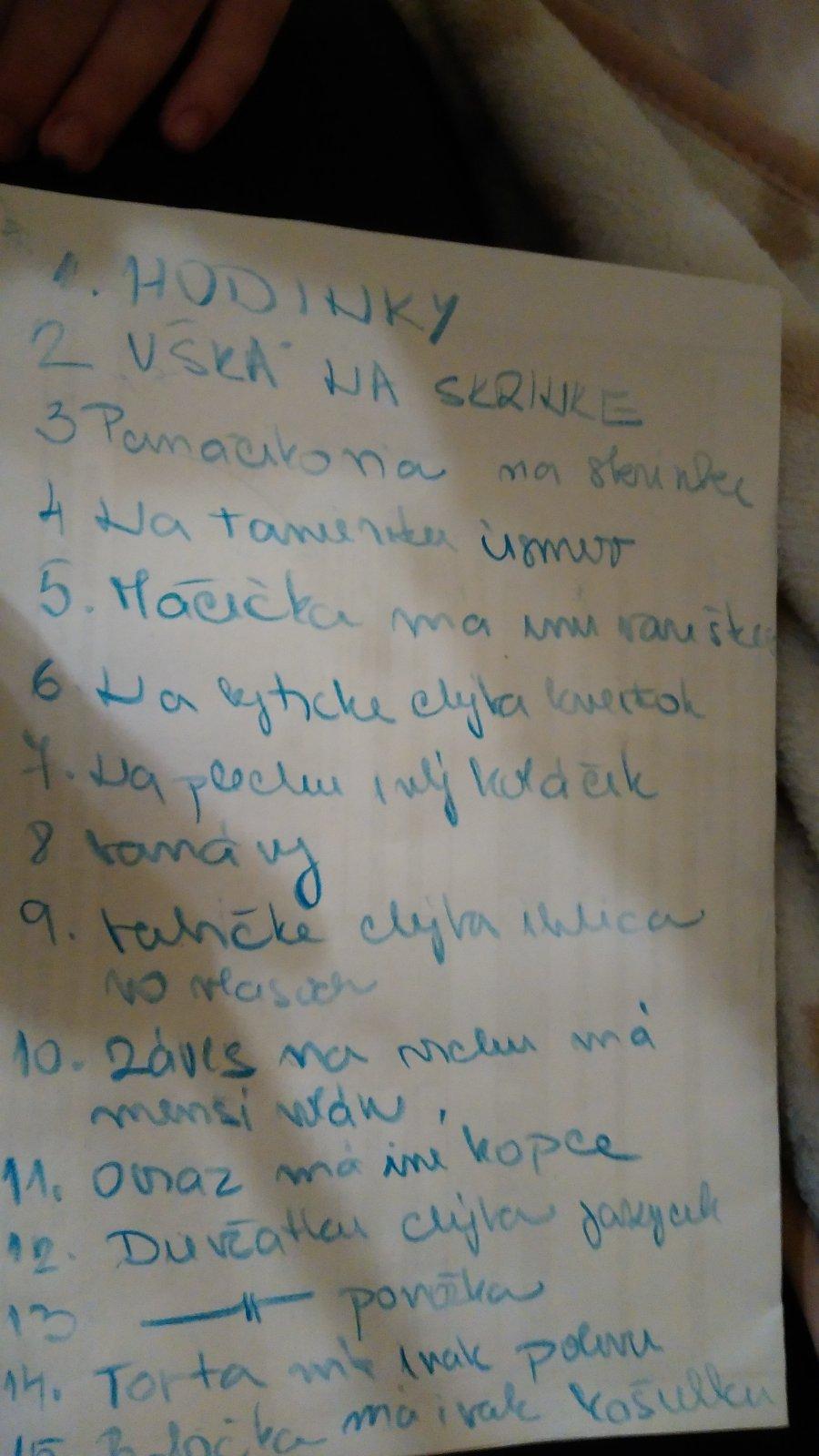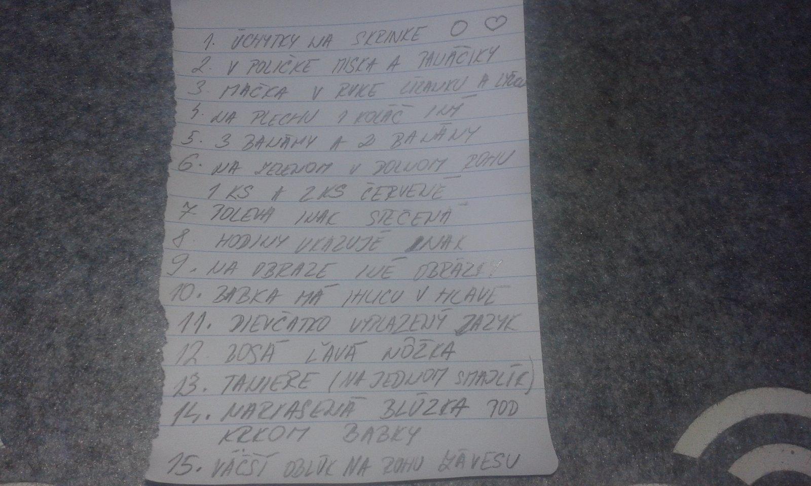 Hodiny, 2.spendlik vo vlasoch, 3.uchytky na skrinkeuchytky, 4.poleva na tortepoleva, 5.bluzka pri krku, 6.kolacik na tacke, 7.kvetinka v kvetinaci, 8.vaza na policke, 9.tanier na policke, 10.nieco v labke macicky, 11.kopec na obrazku, 12.bosa nozka u dievcatla, 13.jazyk u dievcatka, 14.banany, 15.zaclona