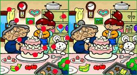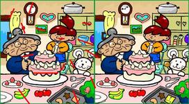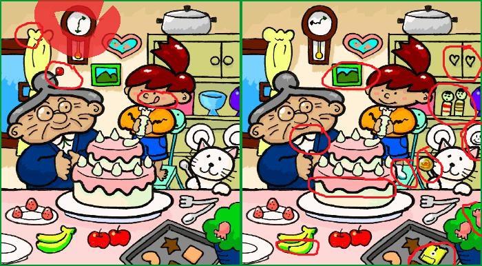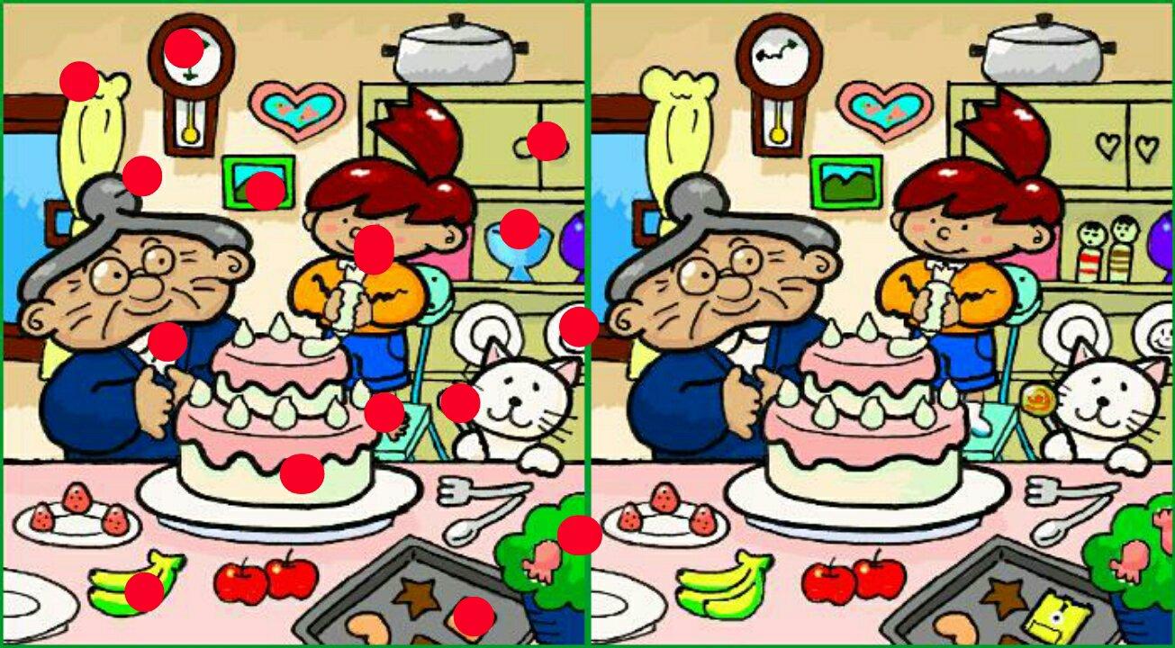 1. ručičky na hodinkách 2.starkej drdol(ihlica) 3. ručky na skrinke vpravo hore 4.v skrinke v polici (v ľavo miska, v pravo panáci) 5.na plechu rozdielne koláče 6. banány 7.v pravo dole kvet 8.dievčatku chýba ponožka 9. dva biele zavesené taniere, na jednom je smajlík 10.mačka má lízatko 11.obraz na stene (kopec) 12.starká golier na košeli 13.dievča vyplazený jazyk 14.poleva na spodnej časti torty 15. vrch záclonky