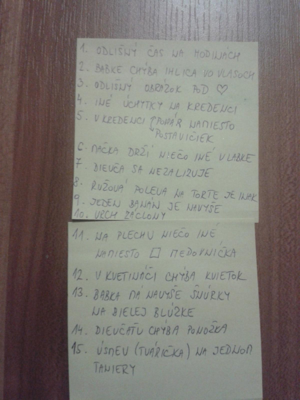 1. hodiny, 2. banany, 3. rucky na skrinke, 4. panaciky na skrinke, 5. kolac na plechu, 6. kopce na obrazku, 7. dole chyba kvietok, 8. iny okraj torty, 9. ihlica v babkinych vlasoch, 10. babkina bluzka, 11. vnuckin jazyk, 12. obrazok na tanieri, 13. lizatko macicky, 14. bosa vnuckina noha, 15. okraj zlteho zavesu