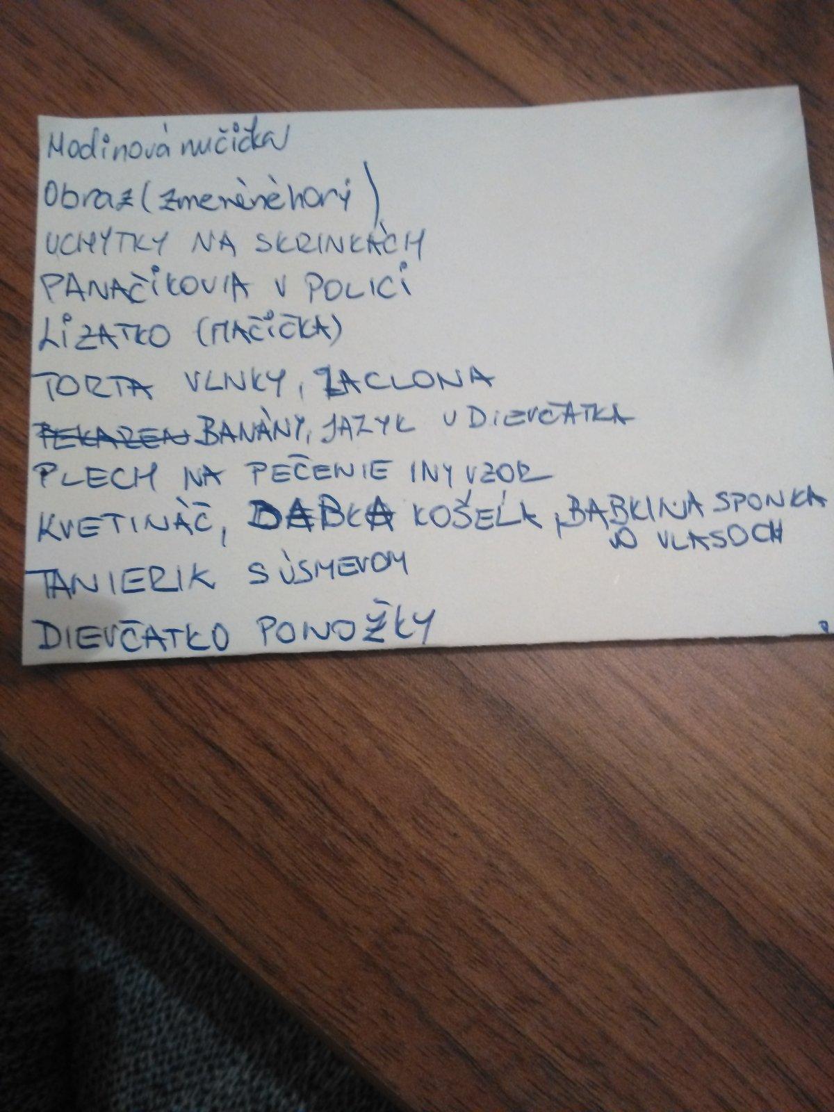 Hodiny, úchytky na skrinke, zelený obraz, banány, koláče na plechu, ihlica vo vlasoch, biela košeľa, mačka s lízatkom, pohár modrý -panáci, ponožka, kvietok, tanier, jazyk, záclona, torta 🙂