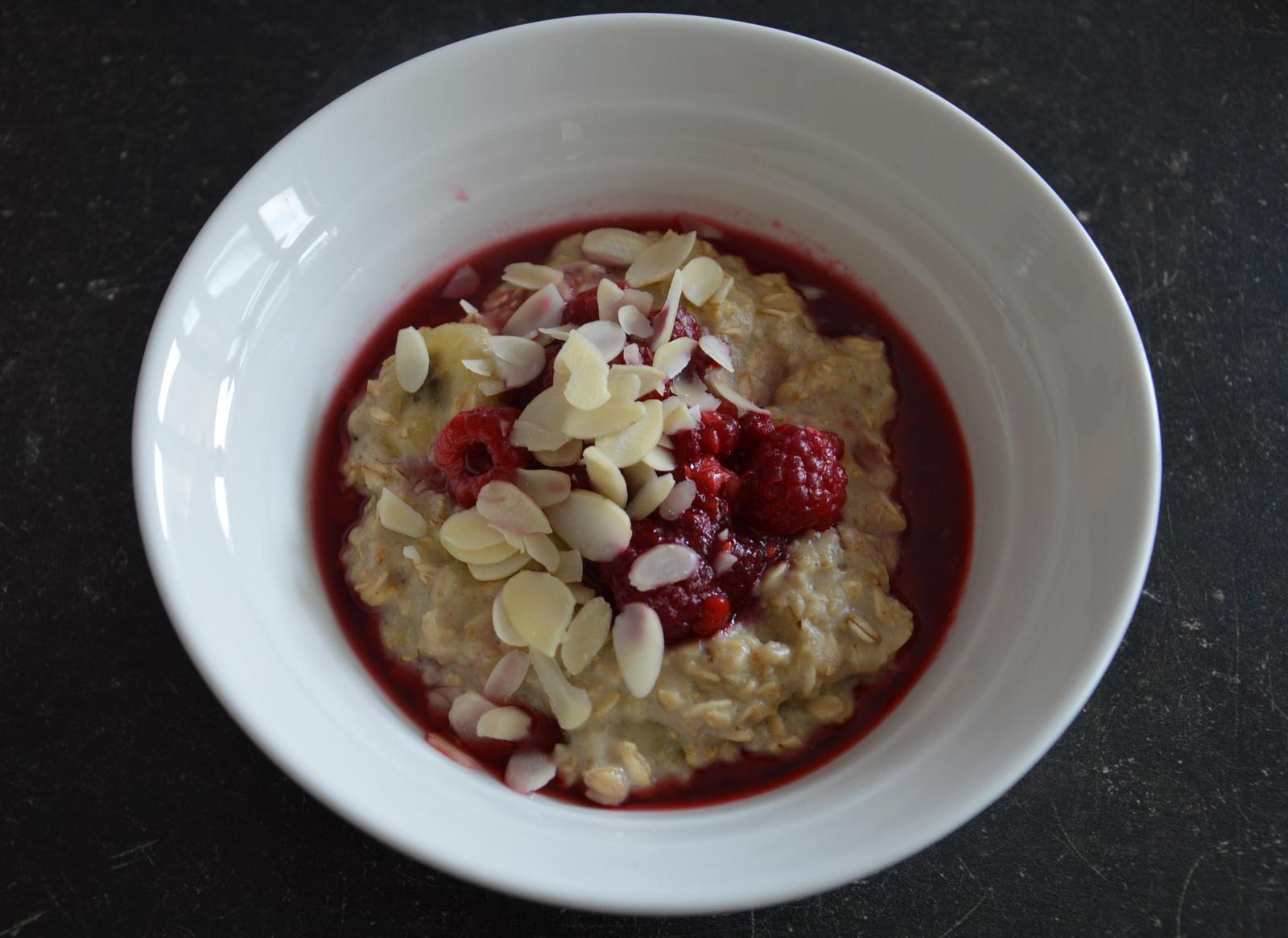 50g ovsené vločky (cca 1/2 pohára)100ml sójové mlieko + 100 ml voda1 lyžička medu1/2 banánu (50g)škorica na ochutenie
