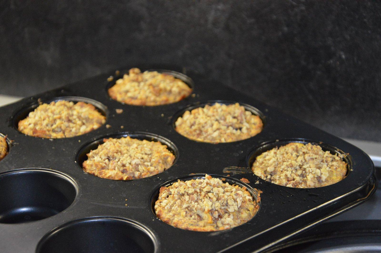 Ingrediencie (na 7 muffinov): 1 šálka (200ml) jemných ovsených vločiek (posekať na mixéri) 1 ČL prášok do pečiva 1 ČL škorica 1 PL kokosový olej (alebo klasické maslo) 1-2 PL med 100g biely jogurt (3% tuku, napr. Hollandia) 1 vajce 2PL sušené brusnice 1 jablko - postrúhala som na rezance aj so šupkou 1-2 hrste vlašských orechov (1/2 do cesta, 2.polovica na posyp)