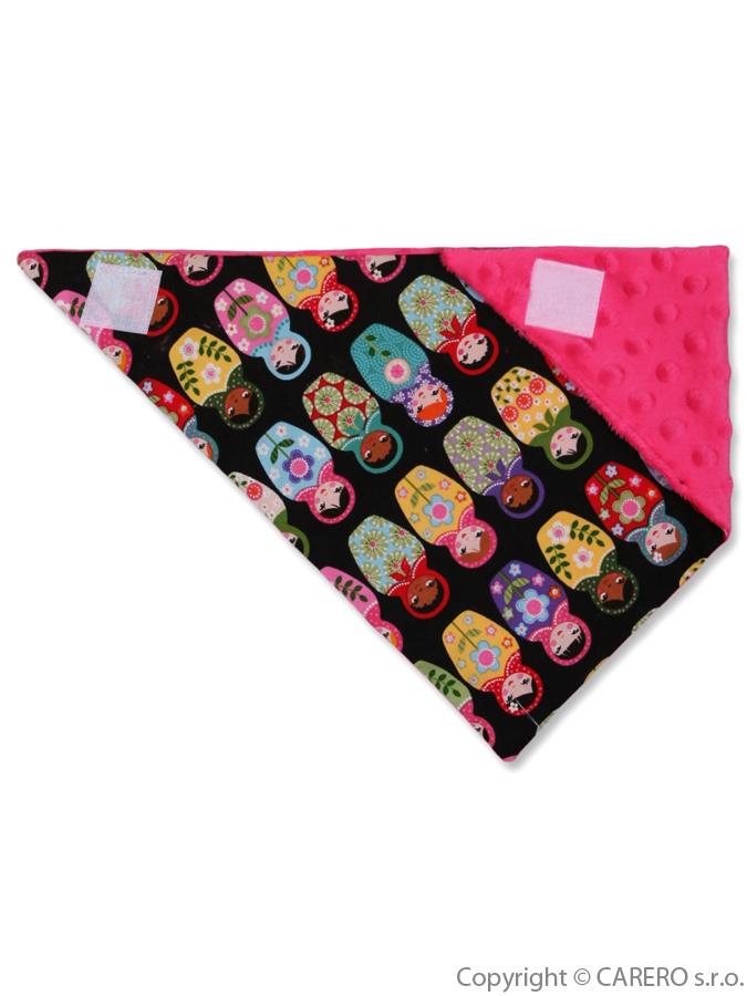 Bavlnená obojstranná šatka na krk pre deti. Jedna strana je bavlnená s obrázkami, druhá strana je vyrobená z Minky látky a je jednofarebná. Šatka má univerzálnu veľkosť a zapína sa za krkom na suchý zips. Šatku možno nosiť obojstranne