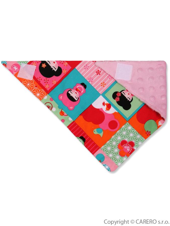 Bavlnená obojstranná šatka na krk pre deti. Jedna strana je bavlnená s obrázkami, druhá strana je vyrobená z Minky látky a je jednofarebná. Šatka má univerzálnu veľkosť a zapína sa za krkom na suchý zips. Šatku možno nosiť obojstranne