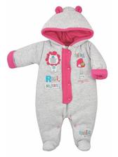 Zimný overal Koala Roger pre bábätká. Overal zdobia obrázky levíčka, vtáčika a nápisy Roger and Bertie, Friends, crazy club a Adventure. Má kapucňu s uškami a zapínanie na zips a cvočky po celej dĺžke. Zloženie: 77% bavlna, 23% polyester. Výplň: vatelín.