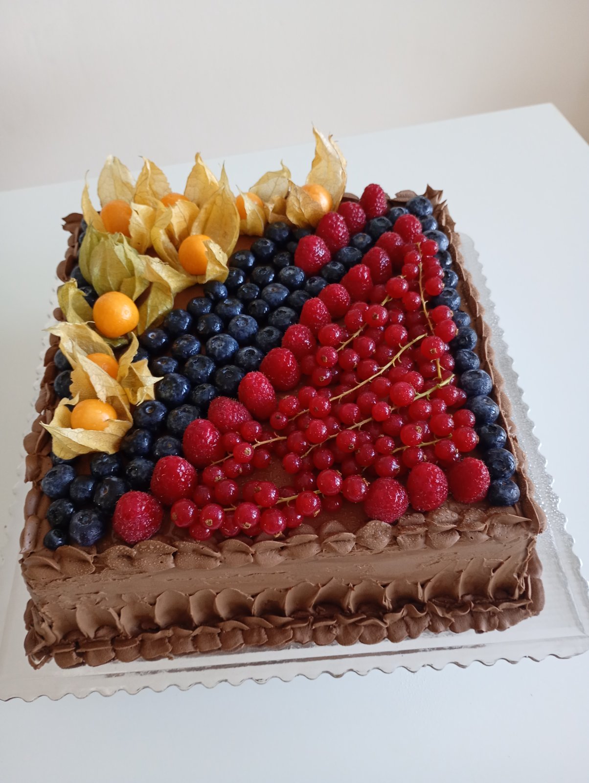 Mramorový korpus, Nutella, čokoládový krém a ovocie. 2x plnená, obtretá cokokremom. 33 porcií.