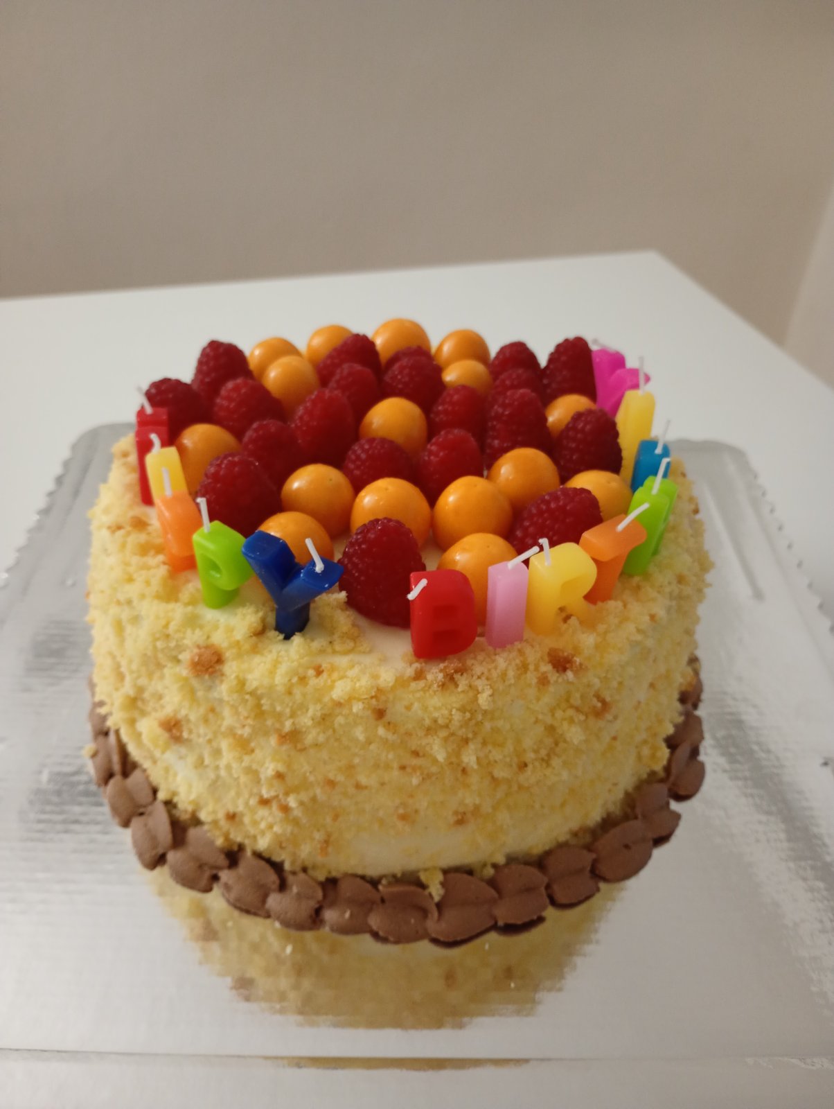 Vanilkový korpus, tvarohový krém+ovocie. 2x plnená.
