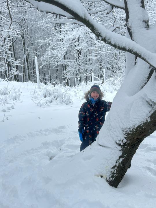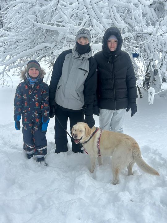 Snow, kids, and our doggie Charlie!! Baba, Friday 🤩