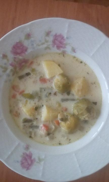 V hrnci rozpustit Ramu,pridat mrazenu zeleninu,trochu soli,vegety a davam aj mletu rascu. Zakryjem a chvilu dusim pod pokrievkou. Zalejem asi litrom vody,pridame nakrajane zemiaky a uvarime domakka. Mlieko,smotanu,syr a muku vymiesam el.slahacom do penista,vlejem do polievky,rozmiesam,pridam ak mam bud medovku alebo salviu a ked polievka zovrie,odstavim. Vyborna