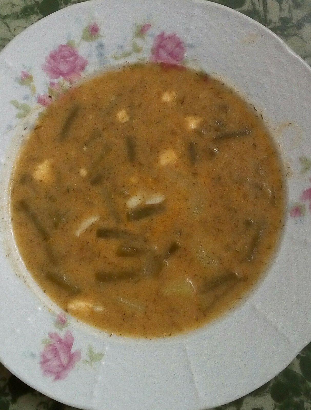 V hrnci roztopím maslo a spením na ňom nakrájanú cibuľu. Po 5 minútach pridám fazuľkové lusky a po ďalších 5 minútach rozotretý cesnak a mletú červenú papriku. Premiešam a zalejem horúcim zeleninovým vývarom. Vložím bobkové listy a nové korenie. Privediem do varu..Po 10 minútach varenia pridám očistené, na menšie kocky nakrájané zemiaky a nasekaný kôpor. Osolím, okorením a varím asi 7 minút alebo kým nebudú zemiaky a struky mäkké.
