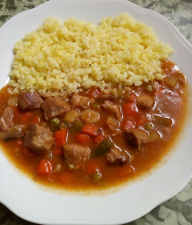 Na masti som si oprazila cibulku,pridala nakrajane na kocky maso,pridala som trosku vegety,mčk,mletej rasce,sladkej mletej papriky a nehala dusit vo vlastnej stave.ked sa stava vydusila,pridala som vodu a mrazenu zeleninu..ked bolo vsetko makke ,pridala som trosku horcice a strucik cesnaku..ked treba zahustim mukou..