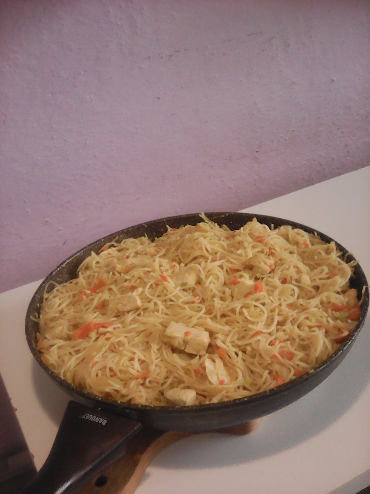 Ryžové rezance pripravíme podľa návodu, tie naše stačí namočiť na 20 min. do vody, scediť a vložiť na 2 minúty do horúcej prevarenej vody (nevariť) a potom precediť. Kuracie mäso nakrájame na kocky, opražíme na oleji, podlejeme troškou vody a podusíme asi 7-10 minút. Mrkvu a kapustu nakrájame na tenké pásiky a pór na tenké polmesiačiky, chilli papričku nadrobno. Asi po 7 minútach pridáme k mäsu mrkvu a papričku, a po ďalších 7 minútach pridáme kapustu. Necháme vydusiť vodu a všetko ešte krátko orestujeme (aby zelenina nebol príliš mäkká...), pridáme 2-3PL sójovej omáčky. Rezance pridáme k mäsu a spolu ešte osmažíme a prípadne dochutíme sójovou omáčkou. Pri miešaní sa najlepšie osvedčili 2 vidličky (v každej ruke jedna).