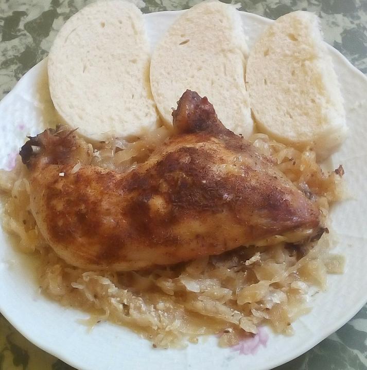 vymastim mastou plech..naukladam kyslu kapustu,dam na nu mletu rascu,natenko pokrajany cesnak,tenke platky slaniny,potriem to cele kyslou smotanou a navrch stehna tie posypem korenim na kura..ked robim ku knedli podlejem bud vodou alebo vyvarom a dam pod alobal piect..ked je maso makke,odokryjem a dozlatista upeciem